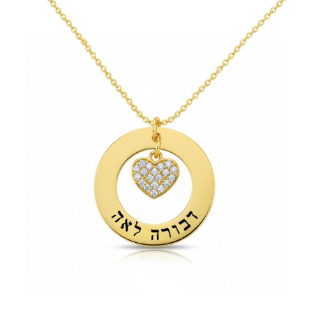 שרשרת עם תליון מעגל עם חריטה בהזמנה אישית. ניתן לחרוט כל שם או כיתוב - (עד 5 מילים). במרכז המעגל תליון לב משובץ זירקונים. קוטר המעגל: 25 מ"מ. אם ברצונכם במעגל בגודל אחר אנא ציינו זאת.