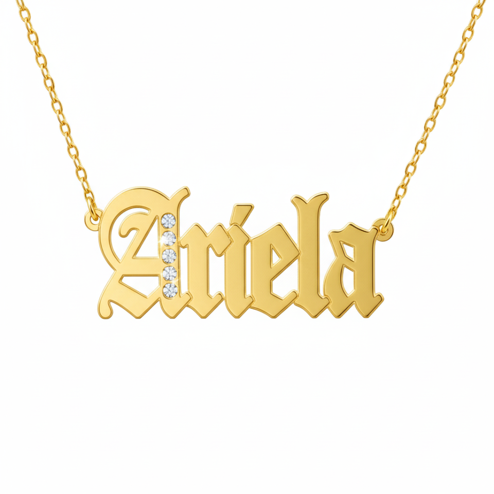 שרשרת שם באנגלית בסגנון גותי - בכתב אנגלי עתיק, עם אבני סברובסקי נוצצות.