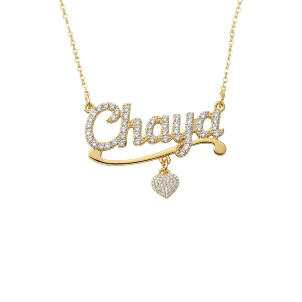 שרשרת שם מרשימה ויוקרתית במיוחד: משובצת כולה באבני זירקוניה נוצצות, בתוספת תליון לב משובץ. ניתן לבחור בתליון חמסה או מגן דוד במקום לב.