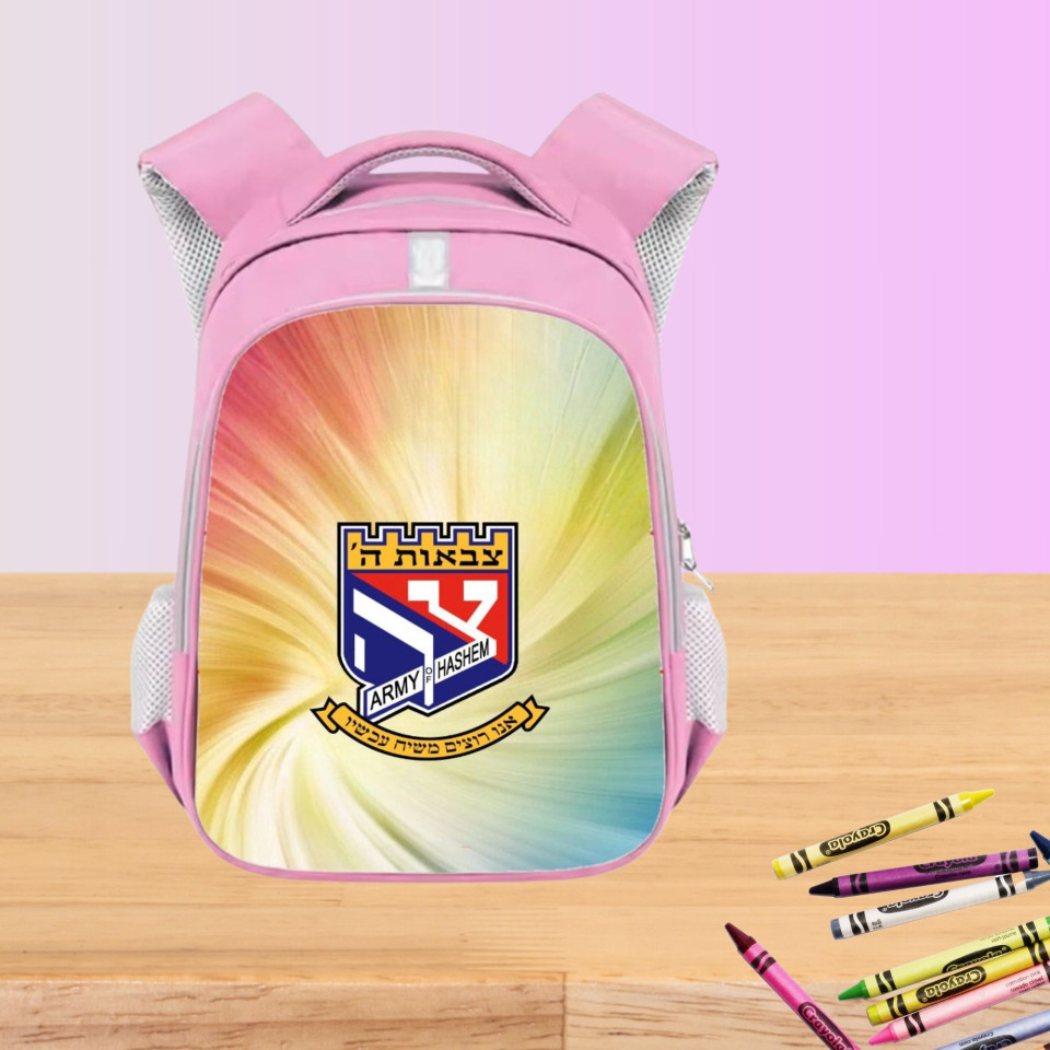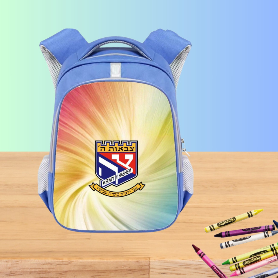 תיק גב לבית ספר עם סמל צבאות השם, להחירתכם בשני צבעים.